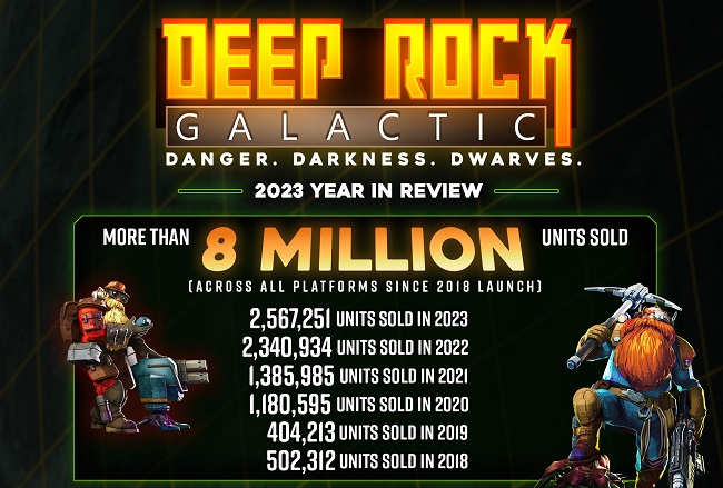 Como ficou conhecido, as vendas totais de Deep Rock Galactic em todas as plataformas alvo ultrapassaram os 8 milhões de cópias (contra 5,5 milhões em 2022). O ano passado voltou a ser o de maior sucesso da história do projeto – 2,567 milhões.