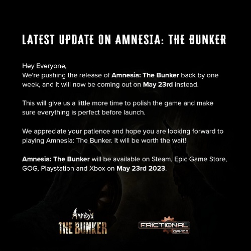 Como ficou conhecido, agora Amnesia: The Bunker está programado para ser lançado uma semana depois, ou seja, no dia 23 de maio. O novo atraso permitirá que os autores aperfeiçoem adequadamente o jogo e deixem tudo pronto para o lançamento.