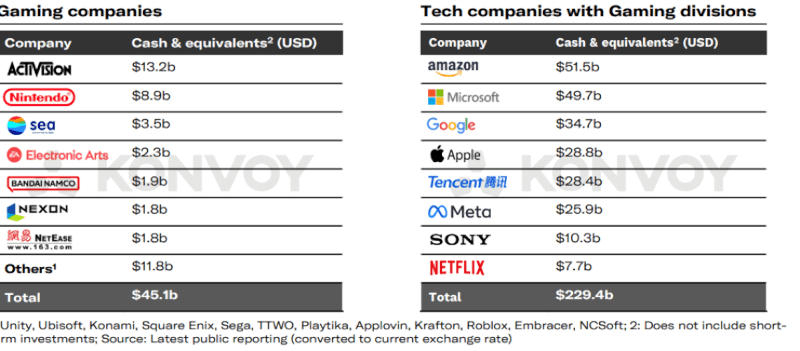 Konvoy apresentou um relatório baseado em informações fornecidas nas demonstrações financeiras públicas de empresas como a americana Activision Blizzard e a Electronic Arts, a Singapore’s Sea, a japonesa Nintendo e a Bandai Namco, a sul-coreana Nexon e a chinesa NetEase – todas elas têm fundos no valor de US$ 45,1 bilhões em dinheiro e equivalentes de caixa. Isto significa que têm recursos suficientes para absorver actores mais pequenos, bem como construir activos sob a forma de propriedade intelectual e produtos.