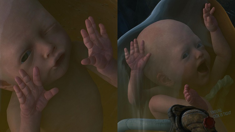 Como o usuário do Twitter Knut observou, as poses escolhidas (ou definidas) para Fanning estão claramente correlacionadas com os gestos potenciais de BB-28 – uma criança em uma cápsula que o protagonista de Death Stranding carrega consigo.