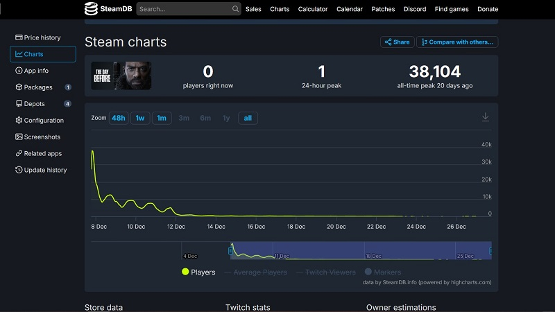 Enquanto isso, a contagem de jogadores simultâneos de The Day Before no Steam chegou a zero, de acordo com o SteamDB. O pico online desde 23 de dezembro não ultrapassou três pessoas.