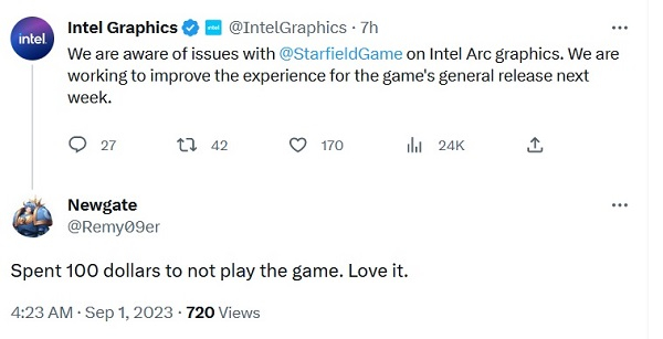 A Intel confirmou em seu microblog que está ciente dos problemas que os proprietários de suas placas de vídeo encontraram ao jogar Starfield, mas não conseguirão resolver a situação rapidamente.