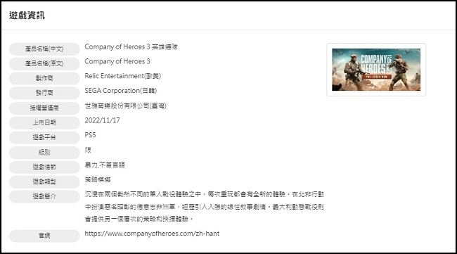 O portal Gematsu notou que o Comitê de Classificação de Jogos Digitais de Taiwan emitiu uma classificação etária para versões da estratégia na comitiva da Segunda Guerra Mundial Company of Heroes 3 para plataformas-alvo não anunciadas.