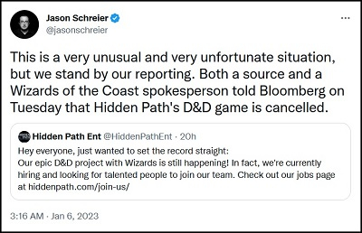 Anteriormente, o jornalista da Bloomberg Jason Schreier anunciou que a Wizards of the Coast (Dungeons & Dragons, Magic: The Gathering) havia cancelado pelo menos cinco jogos não anunciados baseados em suas franquias de fantasia.