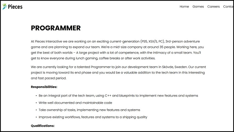 A Pieces Interactive está procurando um programador para seu projeto, que será lançado no PC, PS5, Xbox Series X e S (fonte da imagem: Pieces Interactive)