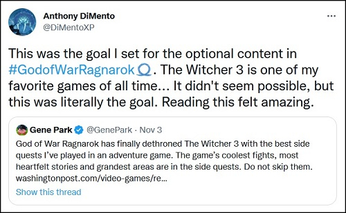 O comentário elogioso de Park chamou a atenção de DiMento. Segundo ele, o objetivo da equipe de conteúdo opcional para God of War Ragnarok era superar The Witcher 3: Wild Hunt nesse aspecto.