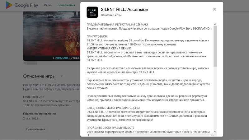 Como observaram os jornalistas do Video Games Chronicle, informações apareceram inesperadamente na página da loja digital da Play Store sobre a data e hora exatas da estreia de Silent Hill: Ascension.
