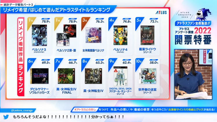 A editora e desenvolvedora japonesa Atlus, como parte da transmissão Atlus Survey 2022 Results Special, resumindo os resultados da pesquisa anual do consumidor, revelou os remakes mais desejados de seus jogos de acordo com os jogadores.