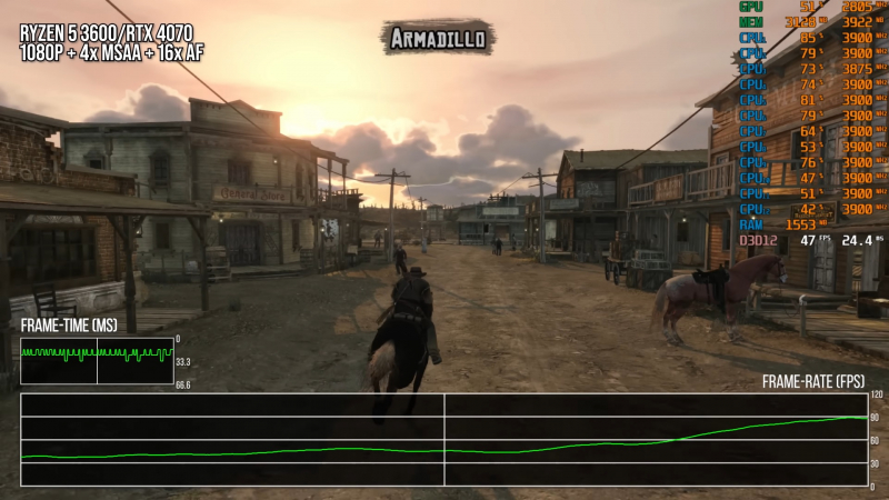 A emulação é um processo exigente, portanto, nem sempre é possível manter 60 fps em RDR em resolução 4K, mesmo com um processador Intel Core i9-12900K e uma placa gráfica RTX 4090. A subsidência é observada em cidades e cenas densamente povoadas.