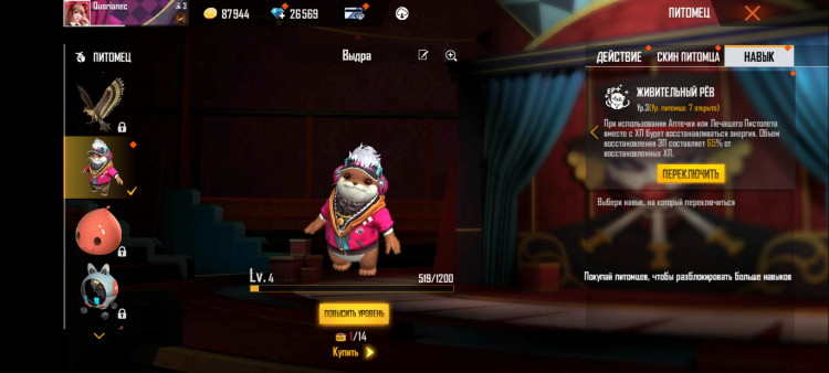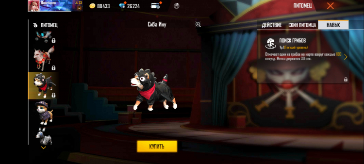 Por exemplo, a lontra dá energia (armadura) quando um jogador é curado com um kit de primeiros socorros ou uma pistola de cura. E Shiba Inu marca um dos cogumelos no mapa a cada 180 segundos. Você pode atualizar seu animal de estimação (e com ele sua habilidade) com a ajuda de uma comida especial. Também é comprado com dinheiro real. Talvez seja dada experiência para os jogos disputados, mas isso, infelizmente, não está totalmente claro.