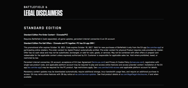 A página agora oculta menciona que a oferta promocional para a pré-encomenda ainda não aberta da edição padrão do Battlefield 6 terminará em 10 de outubro de 2025.