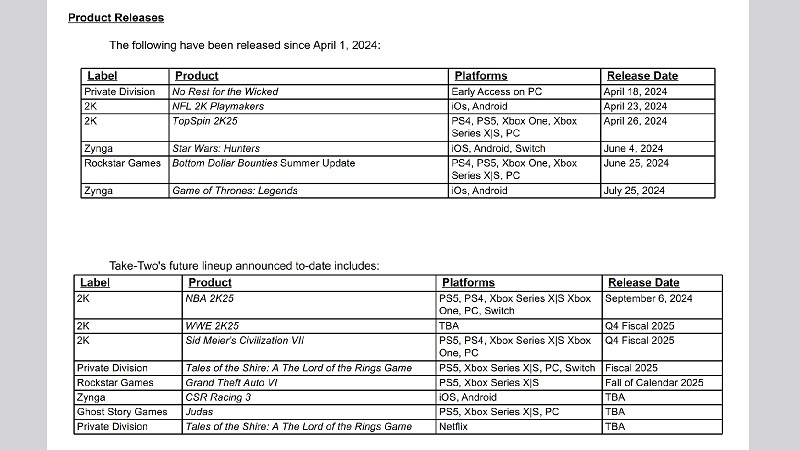 A partir do documento descobriu-se que Civilization VII de Sid Meier está sendo preparado para lançamento no quarto trimestre do ano fiscal de 2025 da Take-Two, ou seja, no primeiro trimestre (de janeiro a março) do ano civil de 2025.