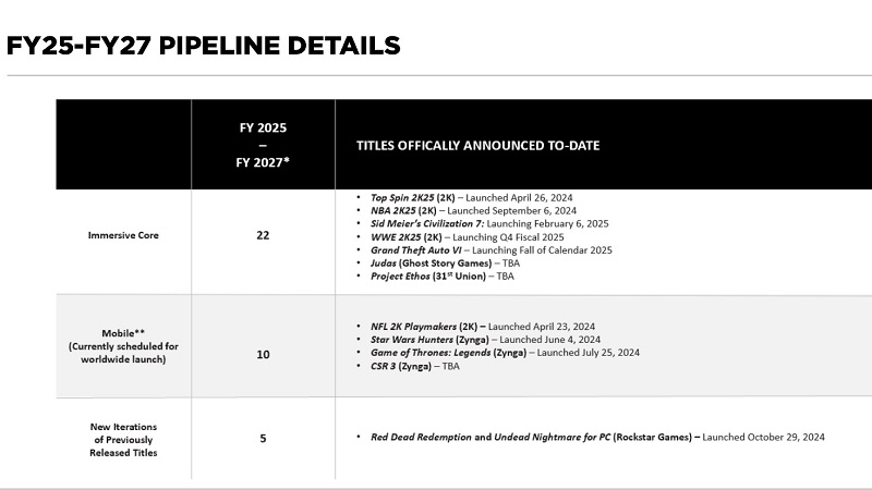 De acordo com um novo relatório da Take-Two, GTA VI ainda está planejado para lançamento no PS5, Xbox Series X e S no outono de 2025. A confirmação pode ser conferida no atual calendário de lançamentos futuros da empresa (veja imagem abaixo).