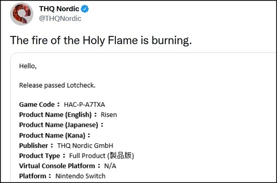 O tweet postado pela THQ Nordic consiste em uma imagem listando informações básicas sobre o próximo port: nome do jogo (Risen), editora (THQ Nordic) e plataforma (Nintendo Switch).