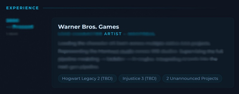 De acordo com o portfólio desse funcionário, ele está trabalhando em dois projetos ainda não anunciados: a sequência oficialmente confirmada do RPG de ação em mundo aberto Hogwarts Legacy e Injustice 3.
