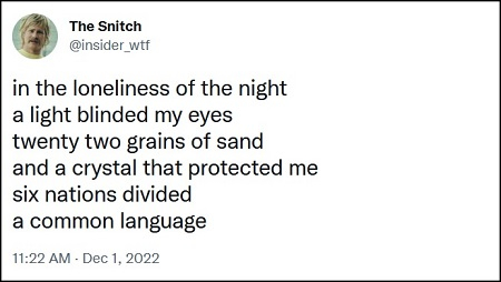 A misteriosa mensagem do pomo é um poema sem rima que fala de “vinte e dois grãos de areia”, “um cristal que me protege” e “seis nações divididas”.