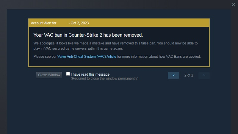 «Desculpar-se. Parece que cometemos um erro. Estamos removendo o bloqueio incorreto. Agora você pode jogar novamente nos servidores deste jogo protegidos por VAC”, diz a mensagem de desbloqueio.