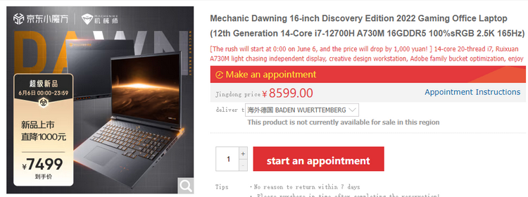 O dispositivo já foi listado no mercado online JD.com ao preço de 8.599 yuans (cerca de US$ 1.274). As pré-encomendas para ele começarão a ser aceitas a partir de 6 de junho. No início, a novidade será oferecida com desconto por 7.499 yuans (cerca de US$ 1.112). A empresa não indica quando começarão as entregas reais do laptop.