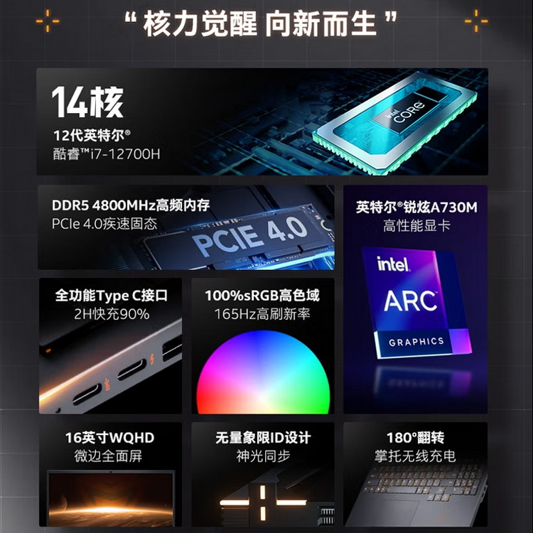 A fabricante reivindica pela novidade uma tela de 16 polegadas com resolução de 2,5K, taxa de atualização de 165 Hz e 100% de cobertura do espaço de cores sRGB. O laptop está equipado com um processador Intel Core i7-12700H de 14 núcleos. Ele é acompanhado por uma placa de vídeo Intel Arc A730M com 12 GB de memória GDDR6 rodando a 14 Gb/s e conectada através de um barramento de 192 bits, que proporciona um throughput de 336 GB/s. O acelerador é baseado no processador gráfico ACM-G10 com 24 núcleos Xe, que incluem um total de 3072 unidades de operação FP32.