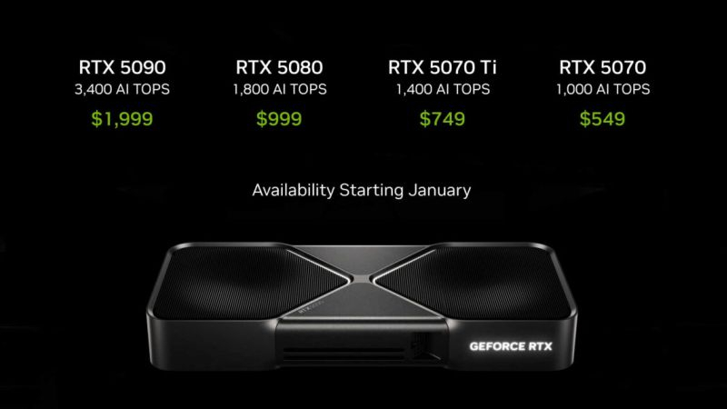 Conforme prometido pelo chefe da Nvidia, a família GeForce RTX 50 começará a conquistar o mercado em janeiro deste ano. A solução júnior, chamada GeForce RTX 5070, com preço de varejo recomendado de US$ 549, oferecerá um nível de desempenho que não é inferior ao da GeForce RTX 4090 que estará à venda em fevereiro; O próximo produto da família em ordem crescente de custo será a GeForce RTX 5070 Ti por US$ 749, e a um passo do carro-chefe estará a GeForce RTX 5080 por US$ 999. É a GeForce RTX 5080 que estará à venda no dia 30 de janeiro deste ano junto com a GeForce RTX 5090. A GeForce RTX 5070 Ti será oferecida apenas na versão de parceiros da Nvidia, sem design de referência, mas a GeForce RTX mais jovem 5070 será oferecido na Founders Edition.