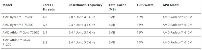 A série de processadores AMD 7020C incluirá quatro modelos com dois ou quatro núcleos Zen 2. O “carro-chefe” da família Ryzen 5 7520C possui quatro núcleos e frequência máxima de até 4,3 GHz. A variante mais lenta faz parte da família Athlon (Silver 7120C) e possui apenas dois núcleos sem suporte a multithreading e roda em até 3,5 GHz. Cada processador tem gráficos Radeon 610M integrados com duas unidades de computação (128 processadores de fluxo).