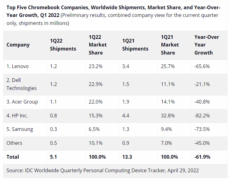 As remessas globais de Chromebooks totalizaram 5,1 milhões de unidades. Isso é 61,9% menos do que há um ano, quando os embarques foram de 13,3 milhões de unidades. Analistas acreditam que as vendas começarão a crescer mais perto do início da nova temporada escolar.