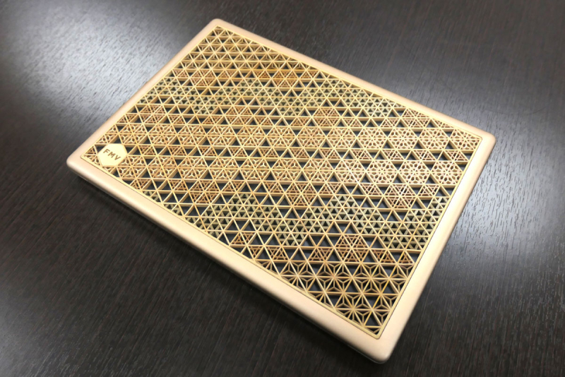 Além dos padrões kumiko, há outros elementos decorativos na capa do laptop. Assim, as sobreposições de madeira receberam as teclas S, F e J, que simbolizam a sigla Shimane Fujitsu Japan.