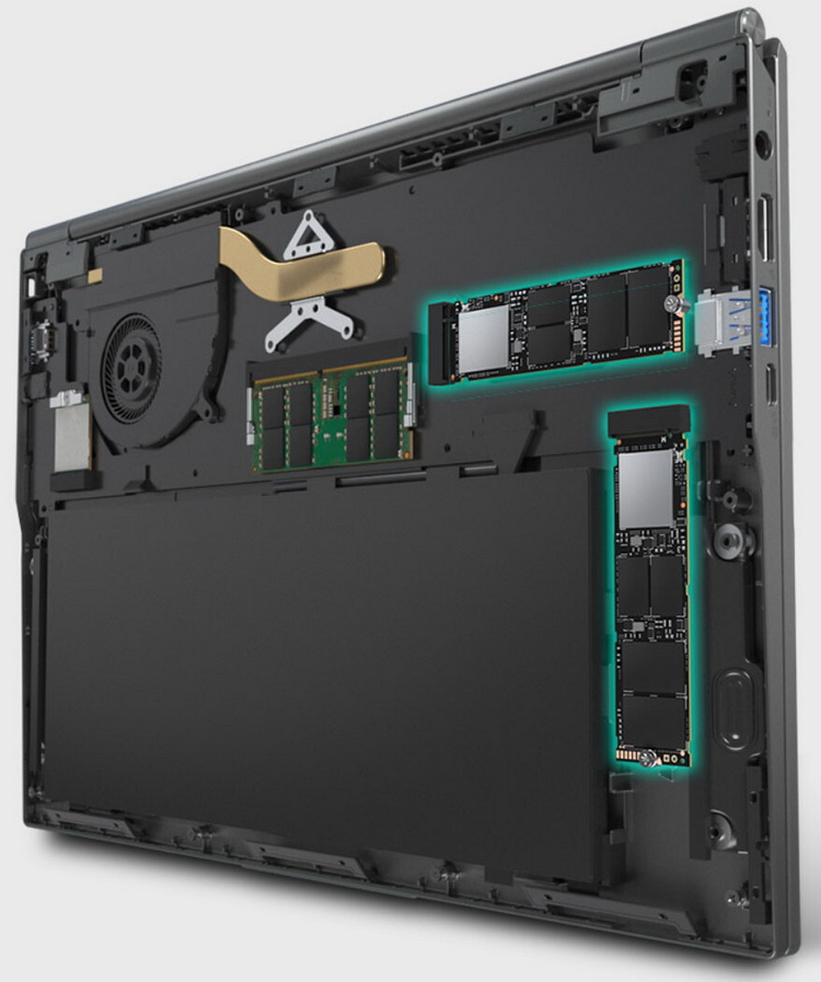 Incomum, especialmente para um laptop compacto, é a presença de um par de conectores M.2 para drives NVMe. Um tem suporte para PCIe 4.0, o outro – SATA ou PCIe 3.0 (dependendo da região de venda).