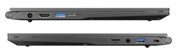 Deve-se notar que a maioria dos Ultrabooks geralmente carece de uma ampla gama de interfaces externas. O novo produto da Gigabyte é uma exceção. Há uma porta Thunderbolt 4 (USB4), uma DisplayPort, uma USB com função de carregamento de 35 W, bem como uma USB 3.2 Gen2, USB 3.2 Gen1 Type-A, HDMI 2.0, conector de áudio de 3,5 mm e um slot com suporte. Memória microSD cartões.