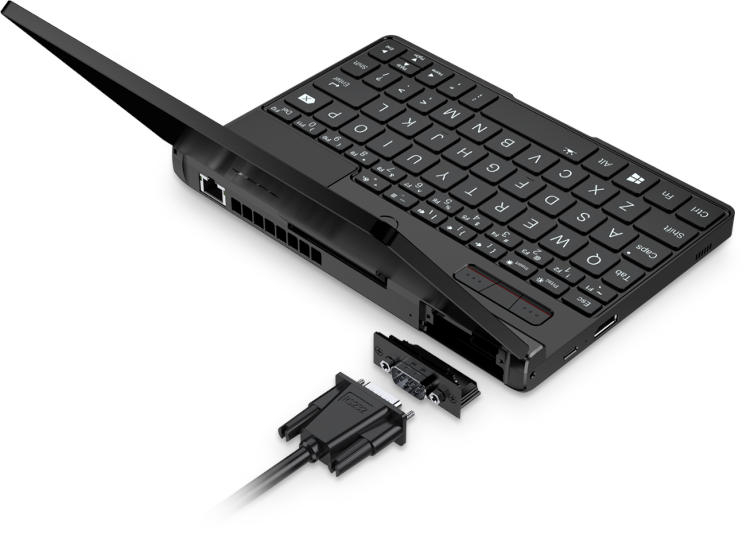 Uma característica distintiva do modelo Pocket 3 é uma porta modular na parte traseira do computador, à qual são conectados os blocos com os conectores necessários. Pode ser, por exemplo, RS-232, projetado para conexão com scanners e impressoras de código de barras, bem como outros equipamentos, que podem ser úteis para um especialista em TI. Também existem soluções tradicionais: três portas USB 3.2 e uma HDMI 2.0b.