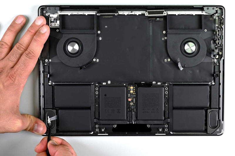 A remoção da bateria novamente requer a remoção do touchpad, pois suas abas adesivas estão localizadas embaixo dos componentes. A tarefa de chegar à placa-mãe acabou sendo “incrivelmente difícil e tediosa” – isso é dificultado por muitos parafusos e cabos. A maioria das portas é fácil de substituir, mas algumas, como MagSafe e slots para cartão de memória, exigem habilidades de soldagem. Como resultado, a facilidade de manutenção do Apple MacBook Pro no chip M4 Pro não mudou – os reparos e a substituição de peças são realizados de forma semelhante ao computador da geração anterior.