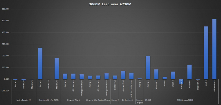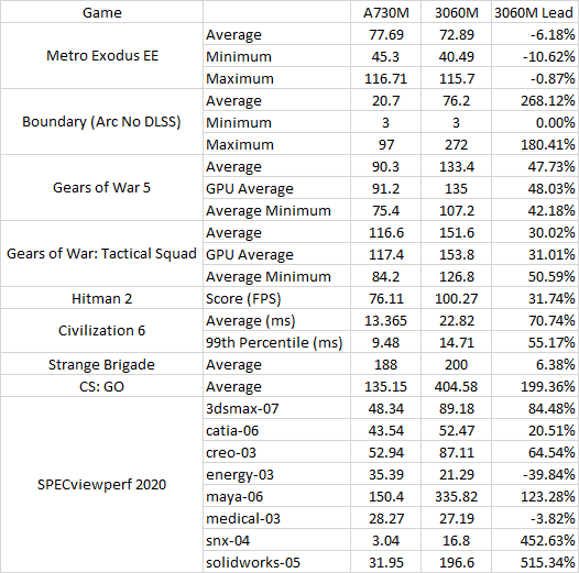 Um gráfico resumido do desempenho relativo do Arc A730M e da GeForce RTX 3060 foi fornecido por um usuário do Twitter com o apelido Redfire. Ele pode ser encontrado abaixo.