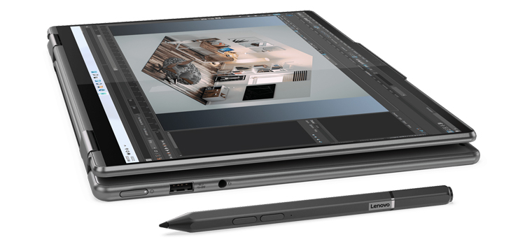 A novidade pode ser equipada com uma tela OLED de 2,8K com resolução de 2880×1800 pixels ou um LCD de 2,2K com resolução de 2240×1400 pixels. Suporta controle de toque. A tampa pode ser aberta em 360 graus para transformar um laptop em um tablet.