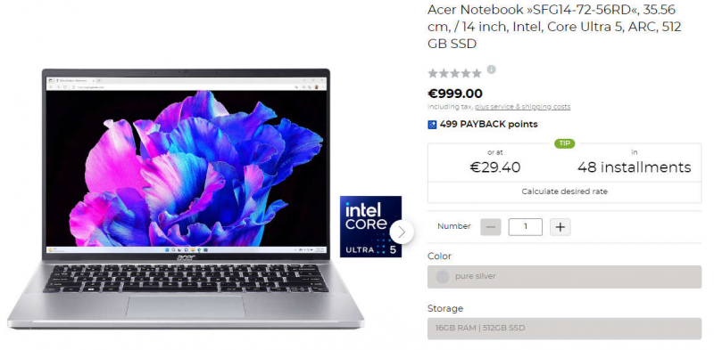 A versão Acer Swift (SFG14-72-7186) com um Core Ultra 7 155H mais potente com frequência de 3,8 a 4,9 GHz, 32 GB de RAM, SSD de 1 TB e a mesma tela é estimada pelos vendedores em 1.249 euros (US$ 1.360 ). Ambos os laptops também possuem bateria com duração de até 11 horas. Em comparação com outros modelos Acer Swift baseados nos processadores ainda atuais da atual série Raptor Lake, os mesmos varejistas oferecem modelos atualizados com chips Meteor Lake com preços praticamente iguais.