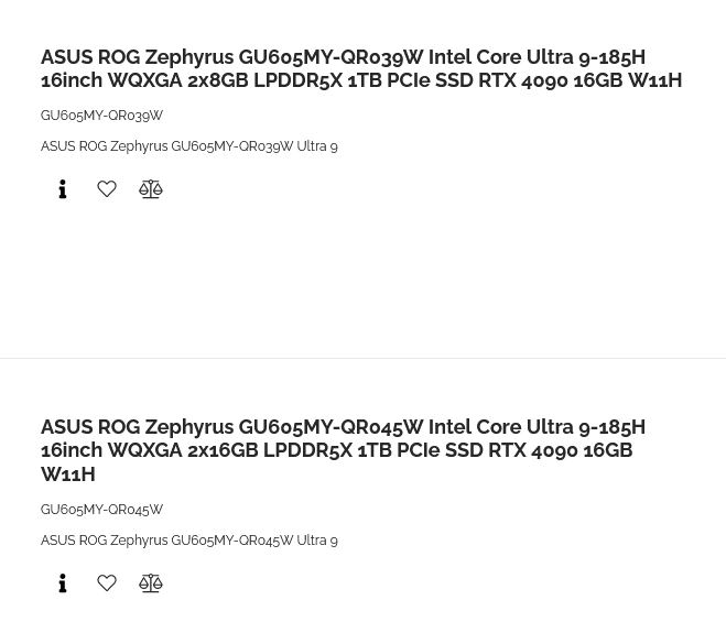 A ASUS também está preparando modelos atualizados de laptops para jogos ROG Zephyrus M16, que oferecerão processadores Core Ultra 9 185H e placas gráficas discretas GeForce RTX 4090 com 16 GB de memória GDDR6. Esses laptops estarão disponíveis em configurações com 16 (2 × 8) ou 32 (2 × 16) GB de RAM LPDDR5X, e também oferecerão telas de 16 polegadas com suporte para resolução de 2560 × 1600 pixels.