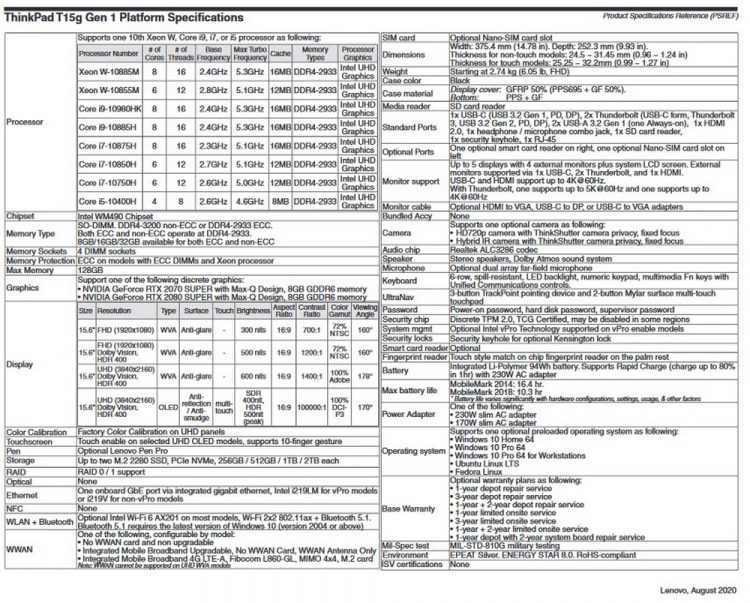 A fonte trazia um slide oficial com as características técnicas da novidade. A partir dele ficou conhecido que o ThinkPad T15g Gen 1 oferecerá uma ampla gama de processadores Intel Core de 10ª geração. A lista inclui os modelos Core i5-10400H, Core i7-10750H, Core i7-10850H, Core i9-10885H e até mesmo o modelo Core i9-10980HK. Além disso, as configurações individuais do sistema podem ser equipadas com processadores Intel Xeon – os modelos Xeon W-10855M ou Xeon W-10885M.