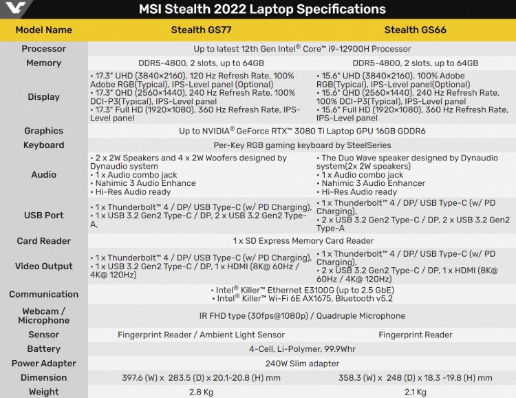 A MSI apresentará os novos notebooks para jogos Stealth Series na próxima CES 2022. As características técnicas do Stealth GS77 de 17 polegadas e do Stealth GS66 de 15 polegadas foram compartilhadas pelo portal VideoCardz. Também se tornaram conhecidos os preços dos esperados laptops.