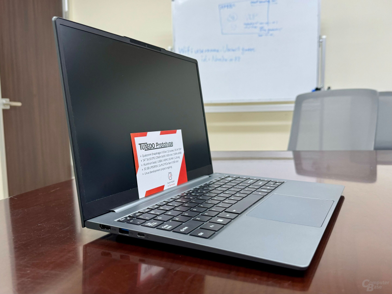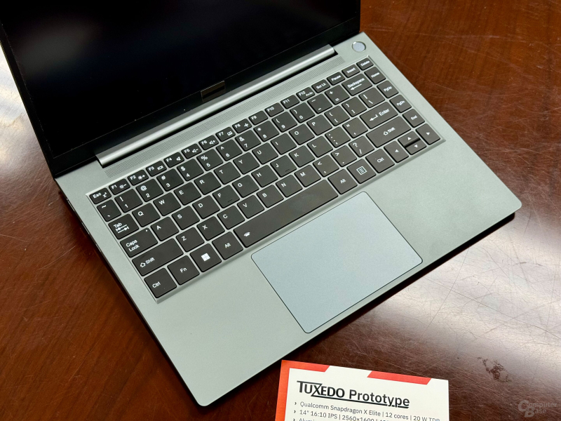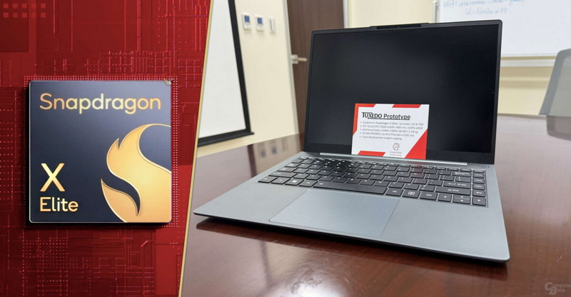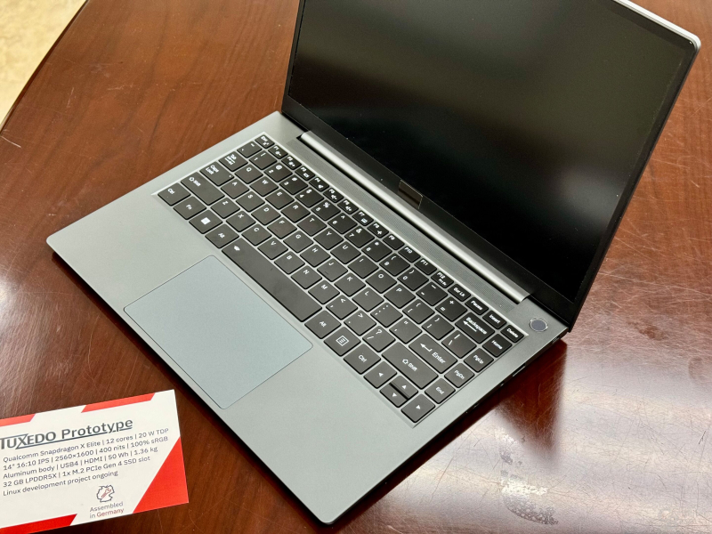 A Tuxedo revelou um protótipo de laptop equipado com o SoC Snapdragon X Elite (X1E80100) com 12 núcleos Oryon com freqüência de até 3,4 GHz e gráficos Adreno integrados com freqüência de 1,25 GHz.