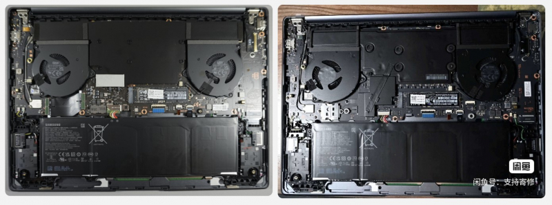 A foto fornecida do Galaxy Book 4 Pro mostra que o sistema de refrigeração do novo produto passou por algumas atualizações em relação ao seu antecessor. No entanto, ele ainda usa duas ventoinhas e uma câmara de vapor instalada em cima dos chips CPU e GPU. A foto à esquerda (abaixo) mostra o interior do Galaxy Book 3 Pro, enquanto à direita está o Galaxy Book 4 Ultra.
