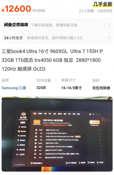 O vendedor está oferecendo o Galaxy Book 4 Ultra com número de modelo 960XG por 12.600 yuans (US$ 1.780). O laptop inclui um processador Core Ultra 7 155H da série Meteor Lake, 32 GB de RAM LPDDR5-7467, uma unidade de estado sólido de 1 TB e uma placa gráfica GeForce RTX 4050 discreta com 6 GB de memória GDDR6. É indicado também que o laptop está equipado com tela OLED com resolução de 2880 × 1800 pixels e taxa de atualização de 120 Hz.