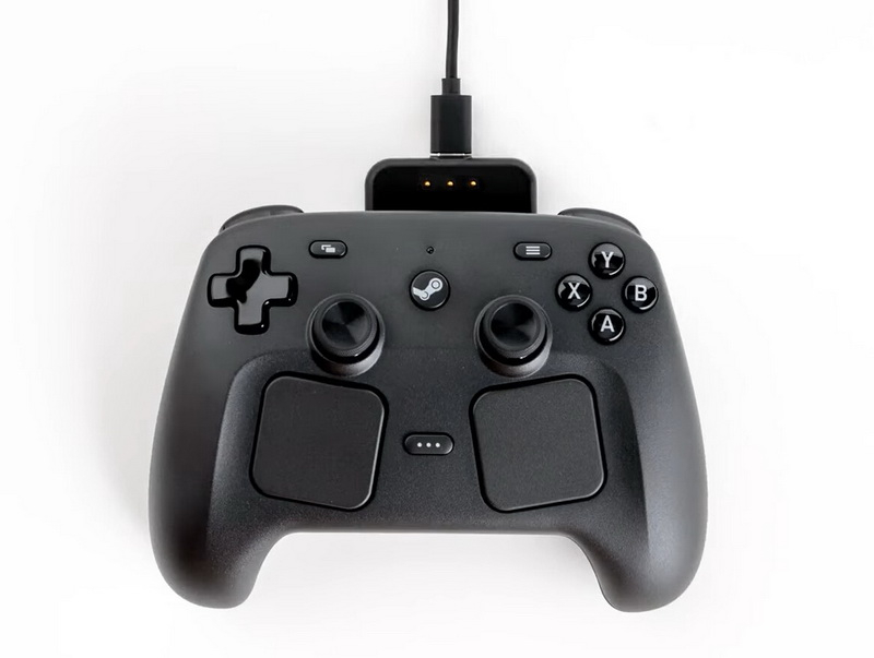 O controle vem com um Steam Controller Puck magnético, que serve como base para carregamento e conectividade sem fio.