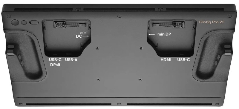 O Cintiq Pro 17 e o Cintiq Pro 22 possuem oito botões programáveis na parte traseira que podem ser usados para atribuir macros ou atalhos em aplicativos criativos como o Adobe Photoshop. Uma diferença notável entre os dois modelos é o layout das portas: no Cintiq Pro 22 maior, HDMI, mini-DP, USB Tipo A e duas portas USB Tipo C podem ser escondidas atrás de tampas removíveis no painel traseiro.