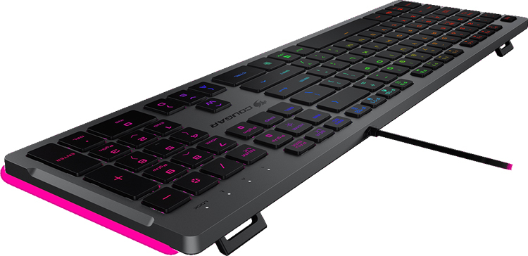 Interruptores do tipo tesoura são usados. A altura total do teclado é de apenas 16,3 mm. Ao mesmo tempo, são fornecidas pernas que permitem elevar as costas.