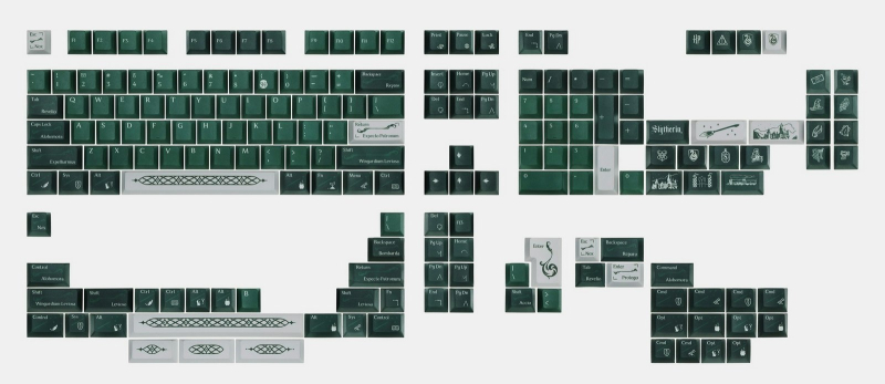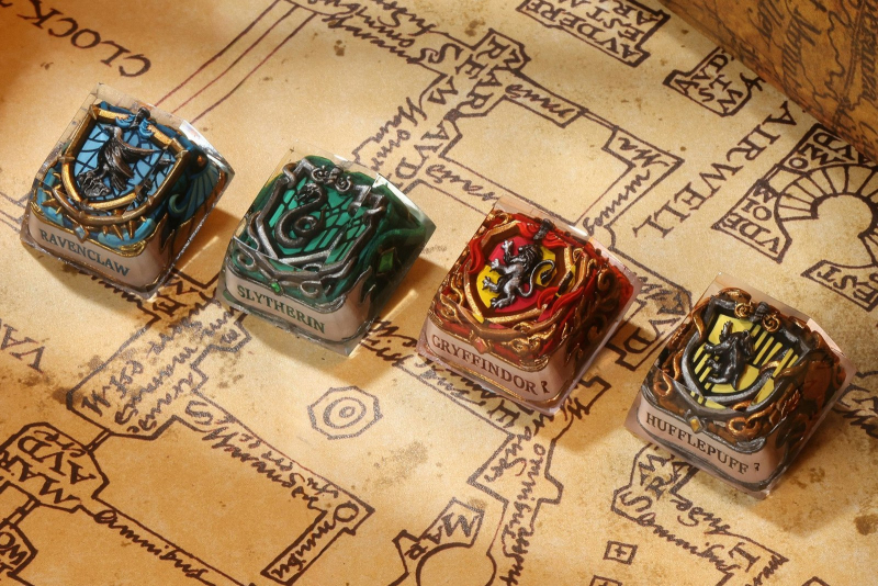 Para quem busca renovar seu teclado mecânico, a Drop oferece conjuntos de keycaps da DCD House compatíveis com o D-pad padrão do Cherry MX. Cada conjunto inclui 185 keycaps, incluindo keycaps especiais com a espada de Godric Gryffindor, o diadema de Ravenclaw, o medalhão de Salazar Slytherin e a taça de Penelope Hufflepuff.