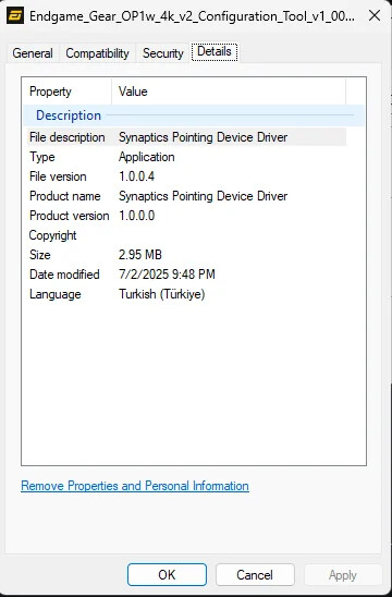 - Verifique o arquivo em si (clique com o botão direito do mouse no arquivo), suas “Propriedades” e a aba “Detalhes”. O arquivo infectado terá “Driver de Dispositivo Apontador Synaptics” no campo “Nome”. O arquivo limpo deverá ter “Ferramenta de Configuração Endgame Gear OP1w 4K V2” no campo “Nome”.