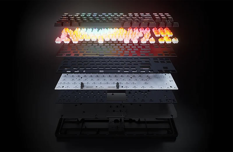 Muita atenção também é dada a outros aspectos que afetam as sensações sonoras e táteis quando pressionados. Para conseguir isso, os principais estabilizadores foram melhorados para eliminar oscilações e chocalhos, e foram adicionadas três camadas de espuma absorvente de som feita de Porylex e borracha de silicone. Além disso, para garantir o movimento mais suave e silencioso possível, cada chave é tratada na fábrica com uma solução lubrificante especial.