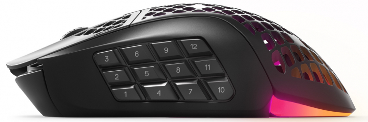 No lado esquerdo do Aerox 9 Wireless há 12 botões programáveis. O mouse tem no total 18 botões, todos mecânicos, com recurso de 80 milhões de cliques. Pesando apenas 89 gramas, este mouse é o mais leve no segmento de roedores para jogos multiplayer.
