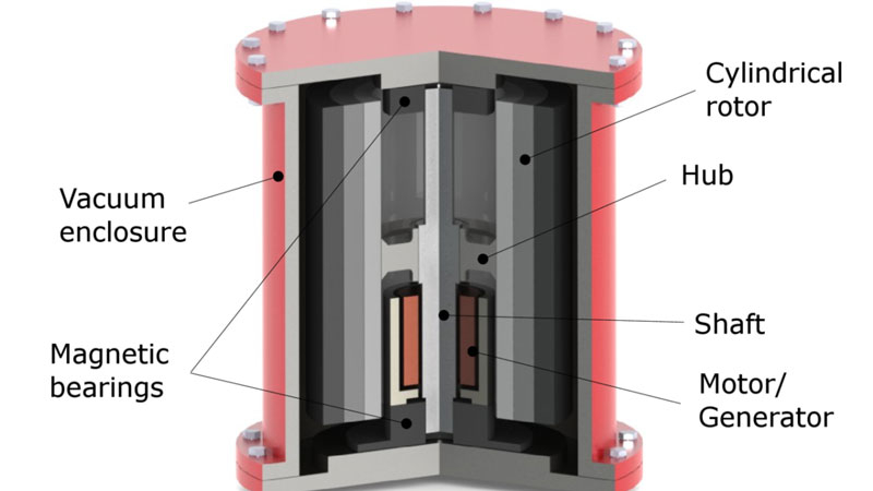 Princípio geral de um dispositivo de armazenamento de energia tipo volante. Fonte da imagem: Pjrensburg, Wikimedia Commons