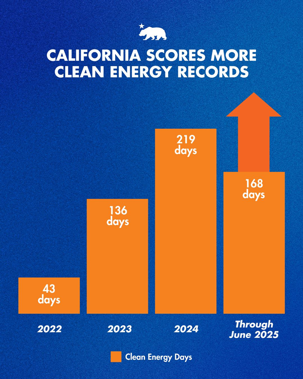 Em média, mais de 9 em cada 10 dias deste ano na Califórnia foram abastecidos inteiramente por energia limpa por pelo menos algumas horas. Em 2025, a rede elétrica da Califórnia funcionará com eletricidade 100% limpa por uma média de 7 horas por dia, todos os dias.