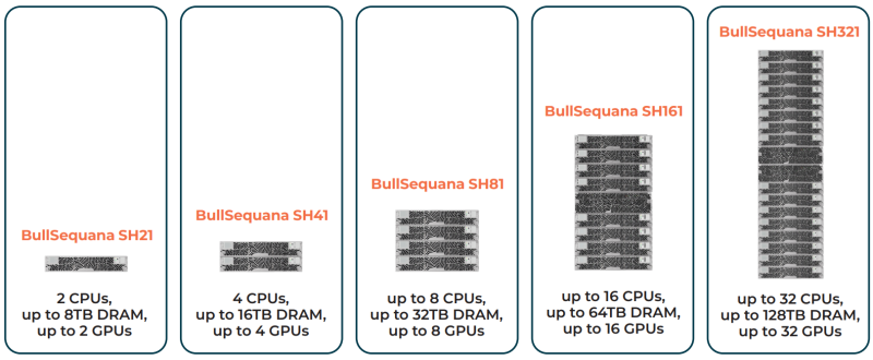 A série inclui os modelos BullSequana SH21, SH41, SH81 e SH161 em formatos 2U, 4U, 8U e 19U, respectivamente. A base são dois nós 2U de soquete, cujo número é um, dois, quatro e oito. Assim, o número total de processadores Xeon 6 nos sistemas varia de 2 a 16. São suportados chips Xeon 6500P e 6700P com até 86 núcleos de computação. Assim, o número de núcleos em um sistema pode chegar a 1376 e threads – 2752.